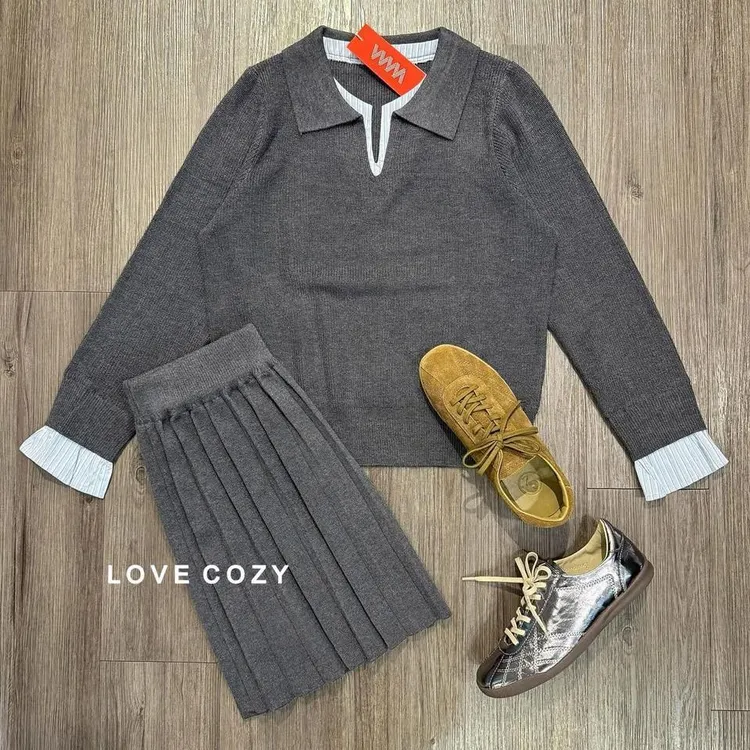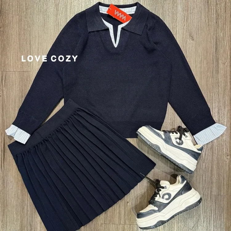 SV拼條紋針織衫百褶裙/二件套組